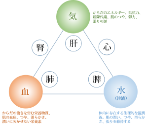 中医学では、皮膚は血脈と経路を通じて、五臓(肝、心、脾、肺、腎)とつながっていて、「気」、「血」、「水(津液)」が美肌を保つ源と考えます。